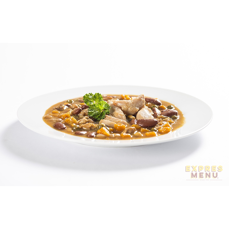kuřecí stehenní maso (31 %), voda, cibule, fazole, mrkev, hrášek, kukuřice, řepkový olej, rýžová mouka, kukuřičná mouka, sůl (jedlá kamenná sůl, jodičnan draselný), paprika mletá, pepř, chilli.