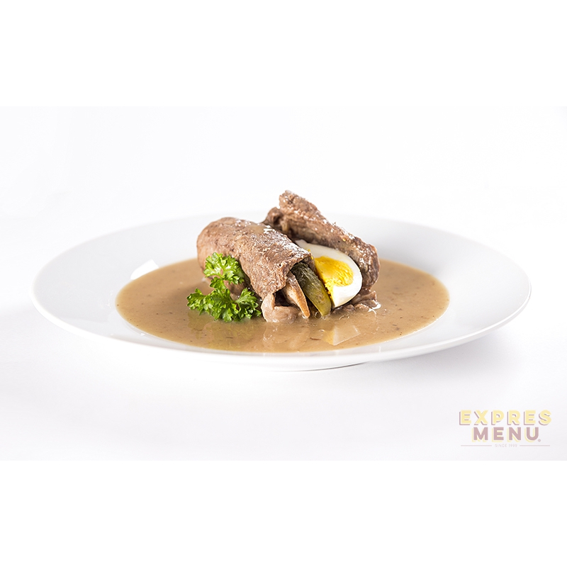 Zadní hovězí plátek potřený hořčicí, pokladený uvařeným vejcem, okurkou a špekem, zatočený a dušený doměkka.