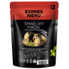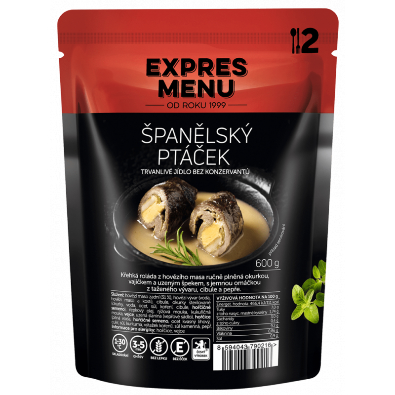 hovězí maso zadní (31%), voda, cibule, okurky sterilované (okurky, voda, ocet kvasný, sůl, kořenící výtažek, hořčičné semínko), řepkový olej, rýžová mouka, kukuřičná mouka, vejce, uzená slanina (vepřové sádlo), hořčice (pitná voda, hořčičné semínko, ocet kvasný, cukr, sůl, kurkuma, koření extrakt), sůl (jedlá kamenná sůl, jodičnan draselný), pepř.