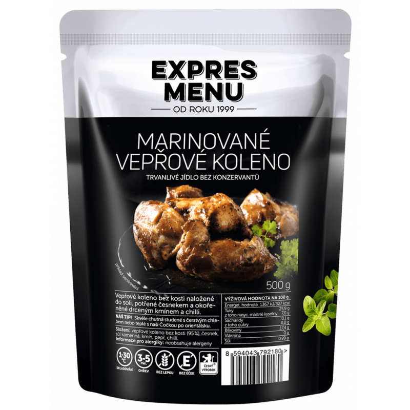vepřové koleno bez kosti (95%), česnek, sůl (jedlá kamenná sůl, jodičnan draselný), kmín, pepř, chilli.