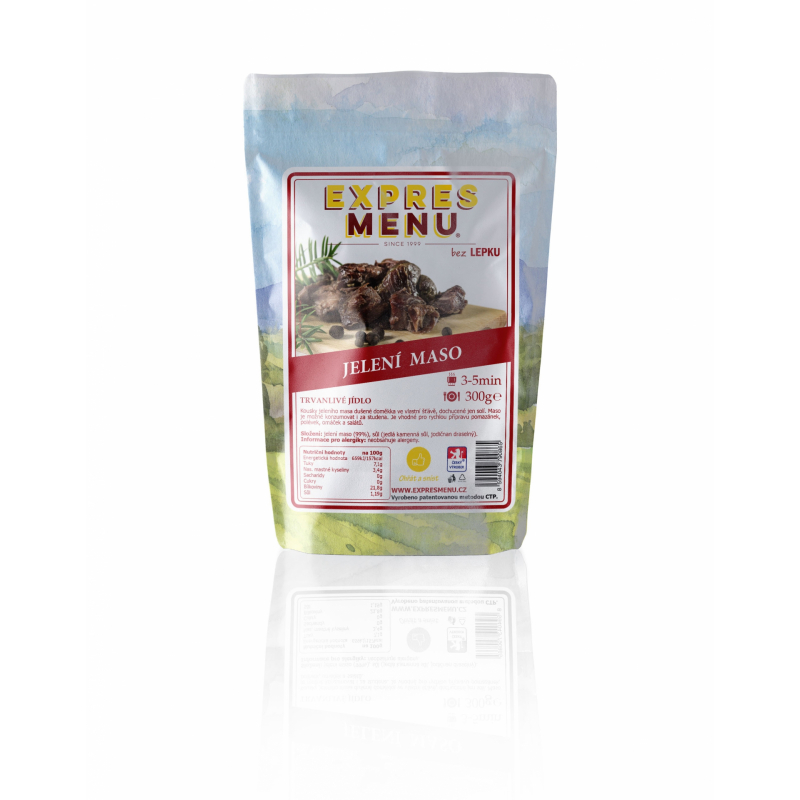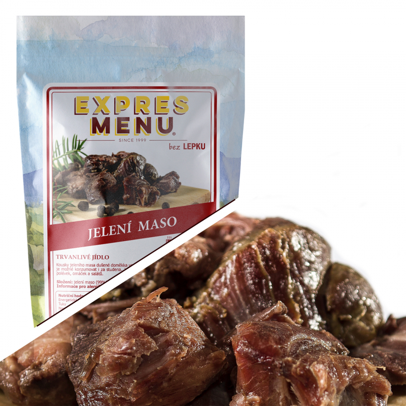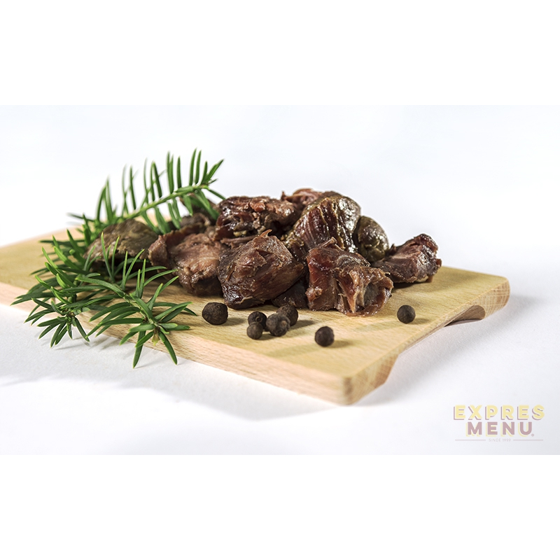 Popis: Kousky jeleního masa dušené doměkka ve vlastní šťávě, dochucené jen solí. Maso je možné konzumovat i za studena. Je vhodné pro rychlou přípravu pomazánek, polévek, omáček a salátů.
