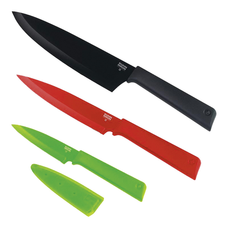 Třídilná sada kuchyňských nožů z nerezavějící oceli Colori Essential. Ergonomická rukojeť z odolného plastu, nůž zelený 19,2 cm, nůž červený 23 cm a nůž černý 30,2 cm. Velmi ostrá čepel