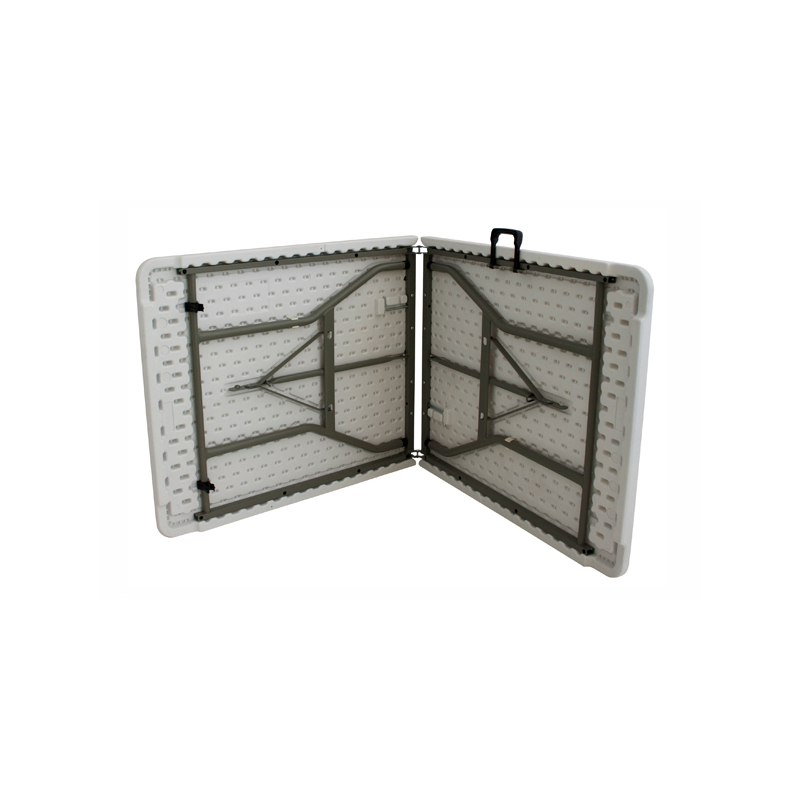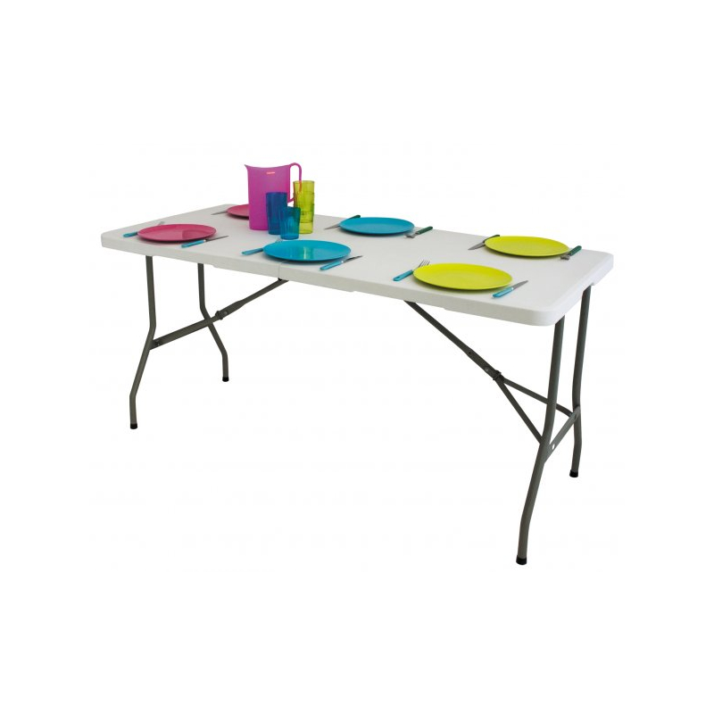 Stůl EuroTrail Pavilion S – s jednolitou plastovou deskou, pevná ocelová konstrukce o průměru 80 mm, která je navíc zpevněna pomocí ramen vedoucích ke středu stolu (pod deskou). Deska se skládá napůl – celý stůl se pak složí jako kufr. Praktické uchycení pro snadné přenášení. Materiál: 100% voděodolný a UV stabilní. Barva: konstrukce šedá, deska stolu bílá. Rozměr: rozložený 152 cm × 71 cm × 75 cm, složený: 78 cm × 71 cm × 10 cm.