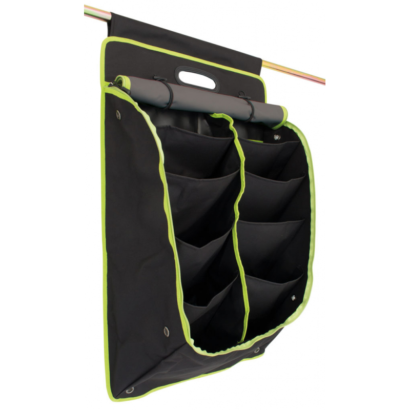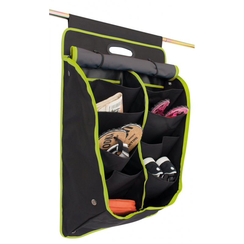 Organizér Oxford L - do svých hlubokých kapes uschová obečení, boty a další potřebné věci. Uzaviratelný na zip, opatřený ventilačními otvory. Má 8 velkých kapes a 2 kapsy ze síťoviny. Prakatické madlo na horní části. Lze jej uchytit do kedrové lišty na karavanu, do tunely na tyč nebo pomocí háčků a ok na organizéru. Rozměr: 53 cm x 80 cm. Materiál: 100% Oxford Polyester. Barva: černá.